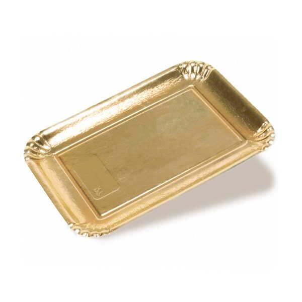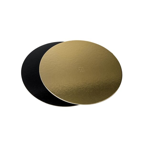 Disco torta bicolore, realizzato in cartoncino. La sua politenatura oro e nera e le sue linee semplici e il bordo merlettato, danno un tocco di eleganza alla presentazione delle tue torte. Compatto e resistente al peso, rivestito da pellicola impermeabile oro sopra e nero sotto. Adatto per l’assemblaggio di torte a piani con contatto diretto degli alimenti. Il suo diametro è di 420 mm. Il confezionamento presenta 10 kg di prodotto per cartone.