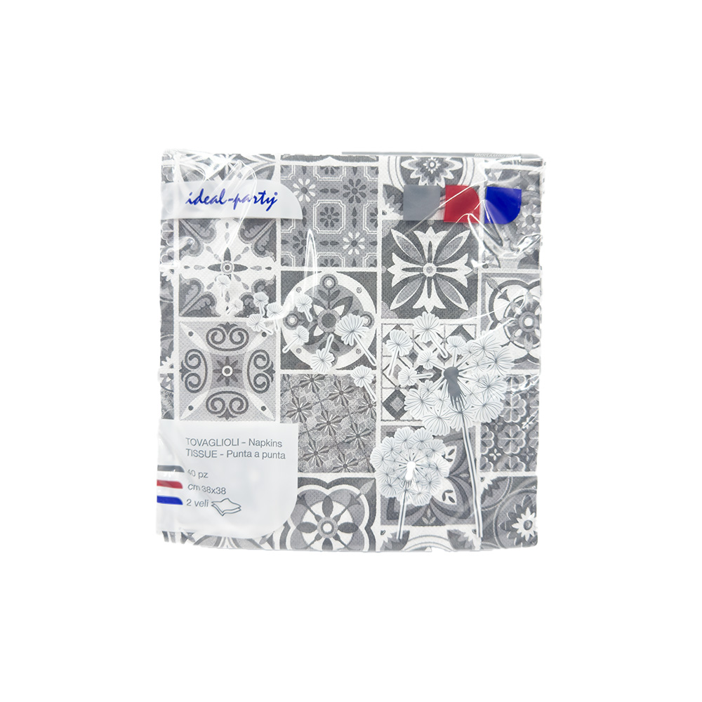 Aggiungi un tocco di eleganza mediterranea alla tua tavola con i nostri tovaglioli in carta punta a punta decorati con motivo maiolica grigio. Di dimensioni 38×38 cm e composti da 2 veli, offrono un’ottima resistenza e una piacevole sensazione al tatto.