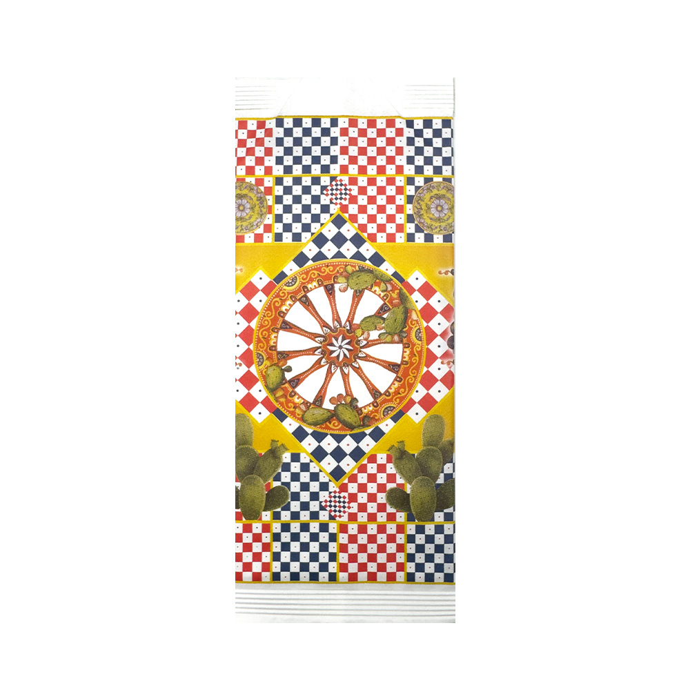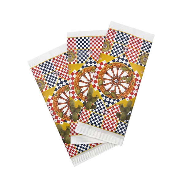 Aggiungi un tocco di colore e tradizione alle tue tavole con le buste porta posate con tovagliolo fantasia tipica siciliana.